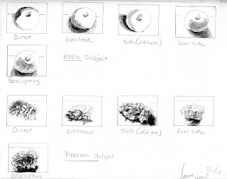 This assignment had us use an apple and a pine cone. Then place a light source different directions and document what happened to the subject in regards to shading and highlighting.
